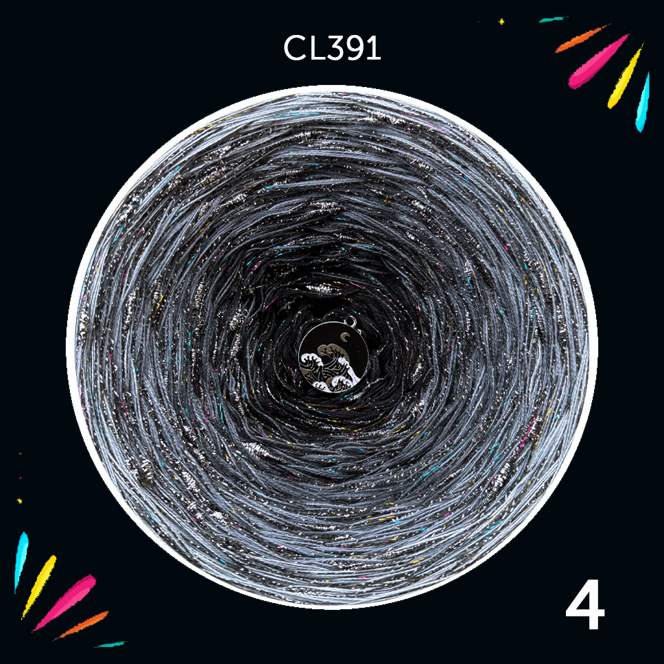 Motek ombre – 3 nitki bawełna 50% / akryl 50% +nopek włoski ze srebrnym lurexem + lurex noir