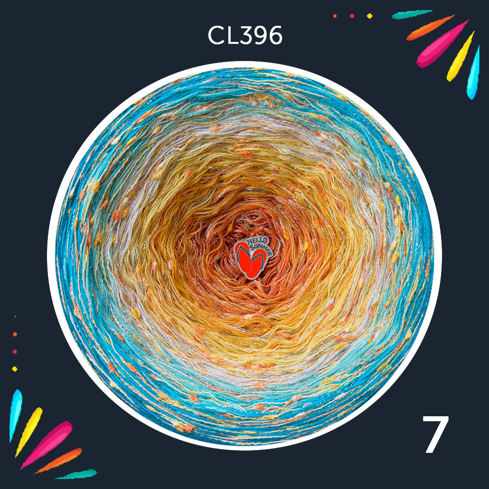 Motek ombre – 3 nitki bawełna 50% / akryl 50% – strelicja, kurkuma, karambola, sezam, turkus, laguna, ciemna laguna + nopek bawełniany słoneczny + lurex na bawełnie regenerowanej morska piana