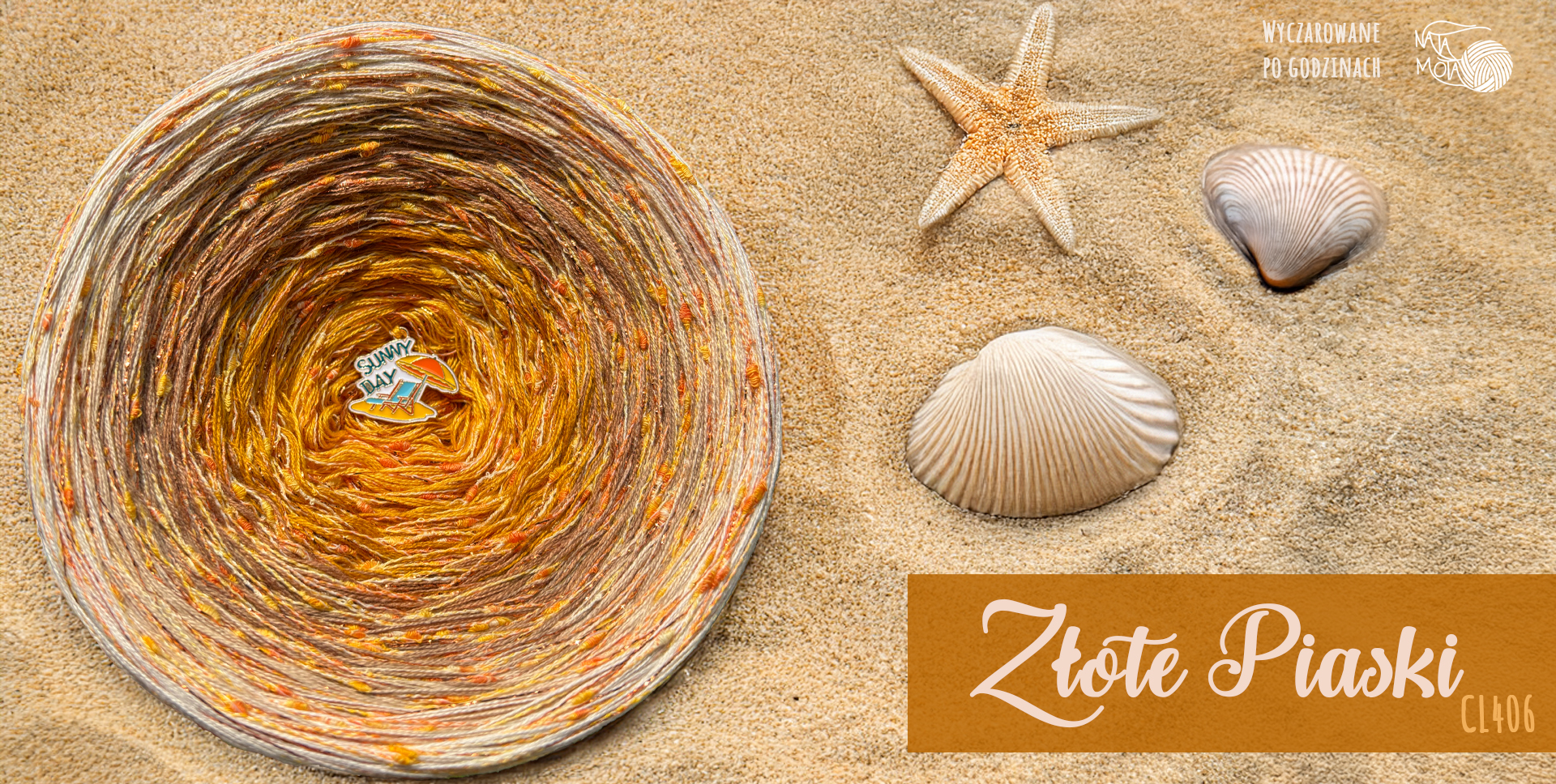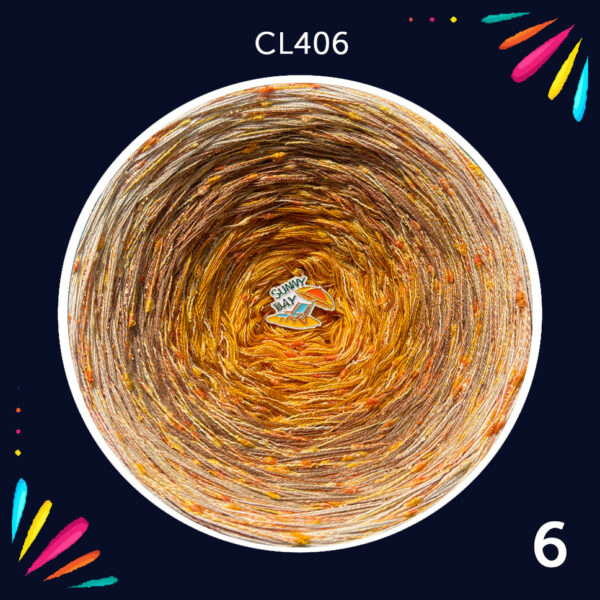Motek ombre – 3 nitki bawełna 50% / akryl 50%, 6 kolorów: kurkuma, masala, miso, salak, tamarynd, sól himalajska + lurex pomarańcza + włoski zółty nopek bawełniany 100%.