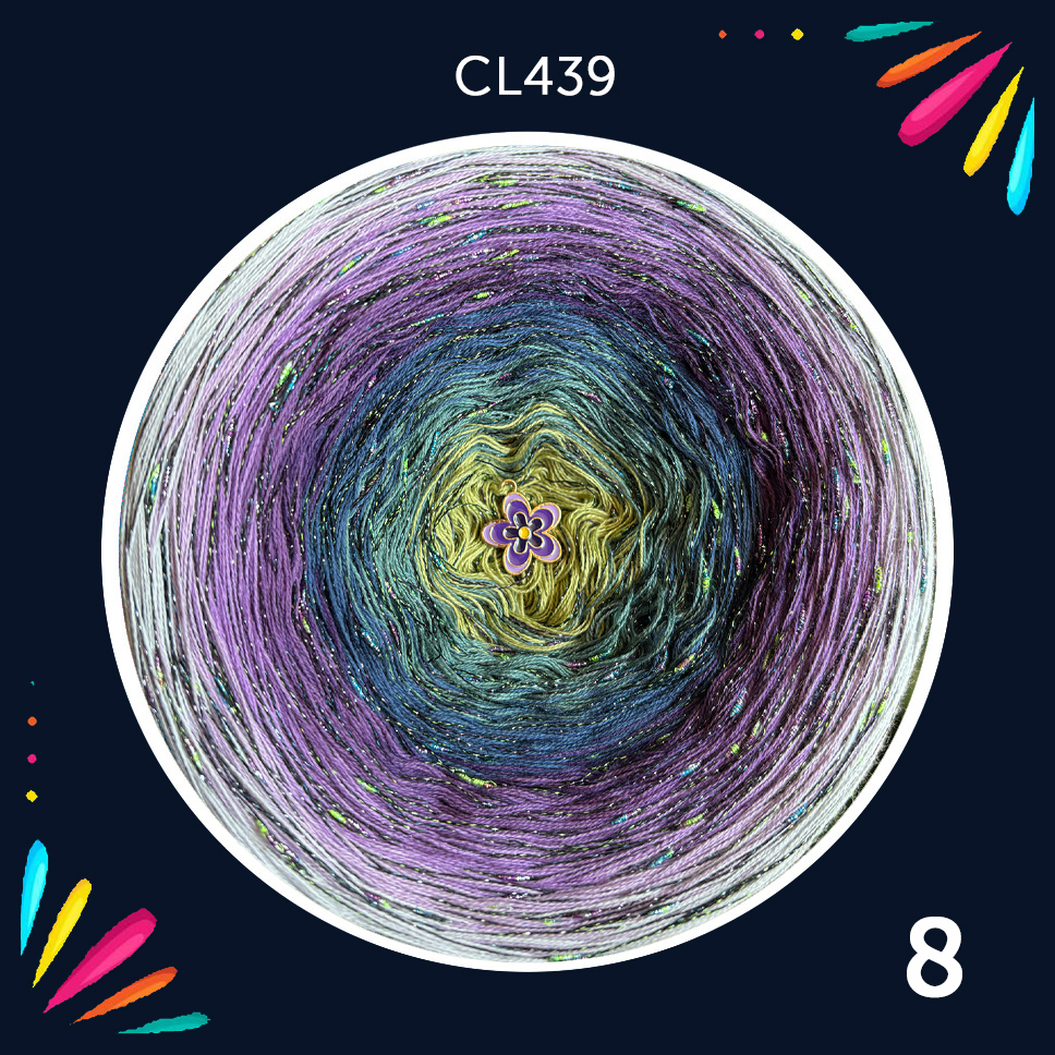 Motek ombre – 3 nitki bawełna 50% / akryl 50%  (8 kolorów) + nopek diamentowy (srebrzysto-zielono-fioletowy na czarnej nitce)