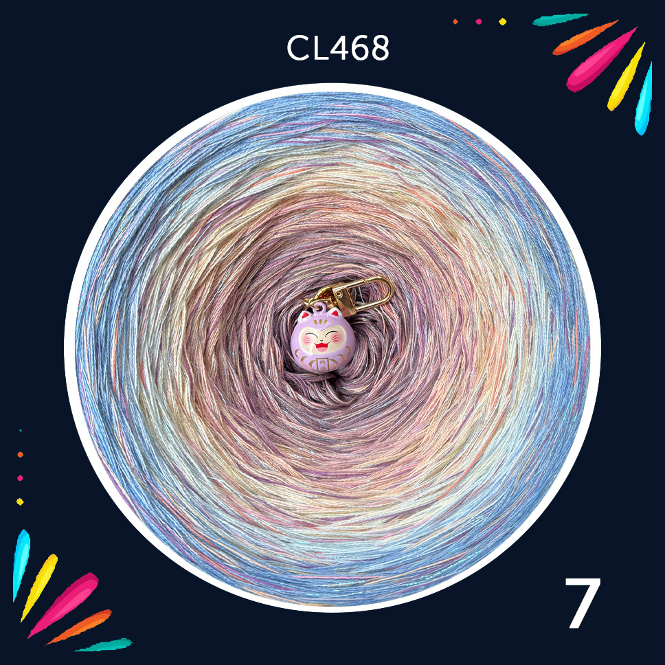 Motek ombre – 3 nitki bawełna 50% / akryl 50%  (7 kolorów) + bawełna 100% cieniowana wschód słońca + lurex opalizujący na błękitnej wiskozie