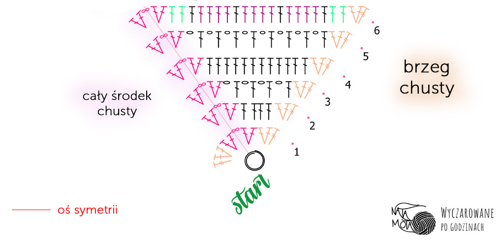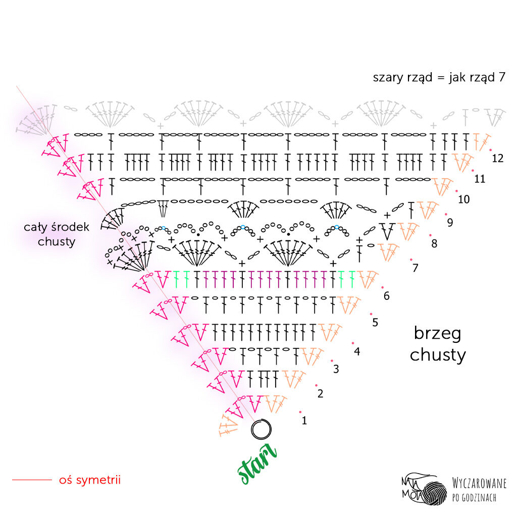 Na dole zaznaczony został “start” czyli najczęściej symbol “magic ring” lub kilka oczek łańcuszka połączonych oczekiem ścisłym. Zieloną strzałką oznaczyłyśmy kierunek, w którym chusta rośnie tworząc swój czubek.